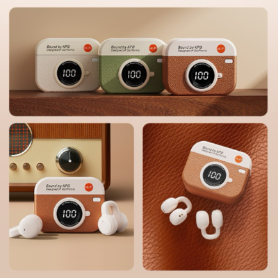 Retro camera-inspired Bluetooth 5.4 ear clip headset with 36-hour battery life, digital display, and ultra-low 0.06s gaming latency, engineered for all-day performance.